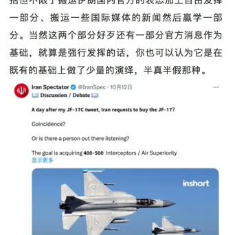 @军武大伊万 :这几天,关于伊朗空军试图从巴基斯坦航空工业联合体购买FC -1 Block3“枭龙”战斗机的传言,正在传得沸沸扬扬。按照传言,说伊朗伊斯兰共和国空军打算以13亿美元的价格购买40架FC-1 Block3型战斗机,这一消息又和近期伊朗正在准备防御以色列的报复、伊朗接收S-400型防空导弹系统的传言结合起来,更是让人如堕五里云雾之中。